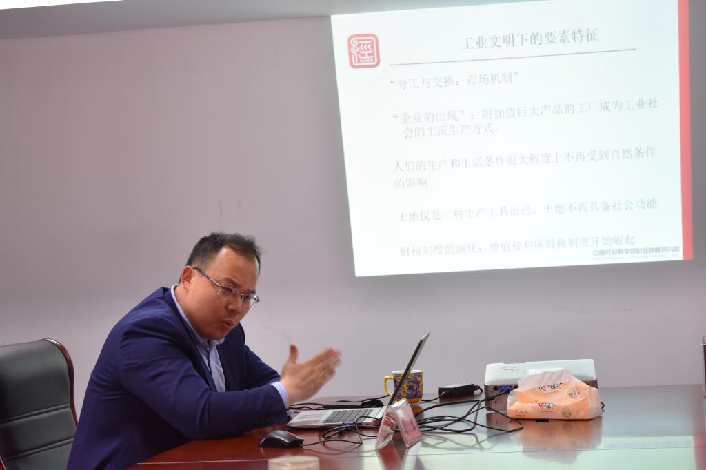 报告会上,蒋震博士详细梳理了农业文明、工业文明与新时代知识信息文明发展推动财税制度演进的历史进程,创新性地从社会能力角度重新审视了宏观税负问题,提出宏观税负是社会能力的对价,体现了政府的资源动员能力。在探讨中国经济增长的动力时,蒋震博士认为中国式分权兼顾了分工和集成两个维度,这也形成了中国特色的制度优势,在渐进式改革中“试错纠错”的机制为中国长期发展提供了源源不断的动力。蒋震博士还结合自己多次参加国内外调研时的亲身经历,给出了自己对技术进步、社会转型以及国家治理的认识和判断。