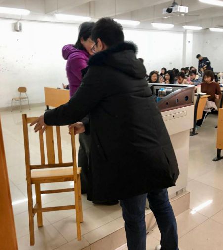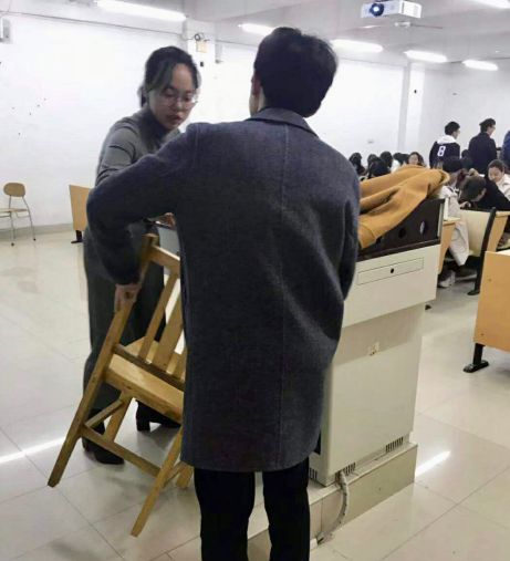 学生为任课老师搬椅子,协助老师做好课前准备和各项服务