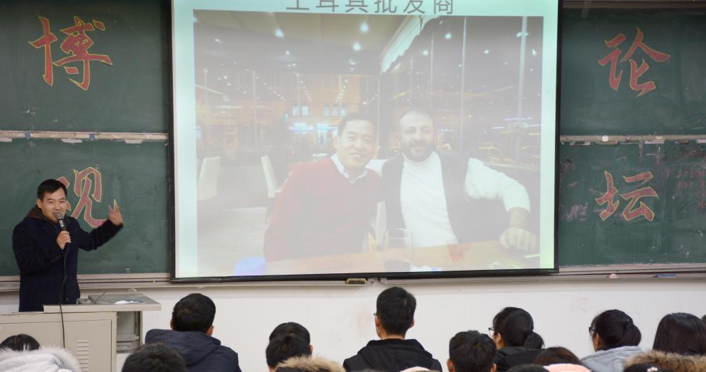讲座进入第二阶段,刘召明教授简述了自己以传播中华优秀文化为使命,在教学之余积极参与埃尔吉耶斯大学的中国文化日和中国美食活动,并教授外国学生太极拳、毛笔字等中国传统文化的经历。他用一张张精美的照片向大家展示了土耳其的美食、风景、交易市场以及宗教风俗,令人心生向往。他通过讲述自己与土耳其朋友之间的故事,生动形象地展现了土耳其人民热情好客、朴实大方、能歌善舞的民风性格。同时,他告诉同学们,土耳其有很多的美景,也有很多的风俗习惯,但并不是所有的都是适合自己的,我们应该用客观的眼光去看待不同的风俗文化,辩证地进行学习。
