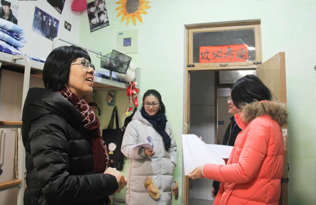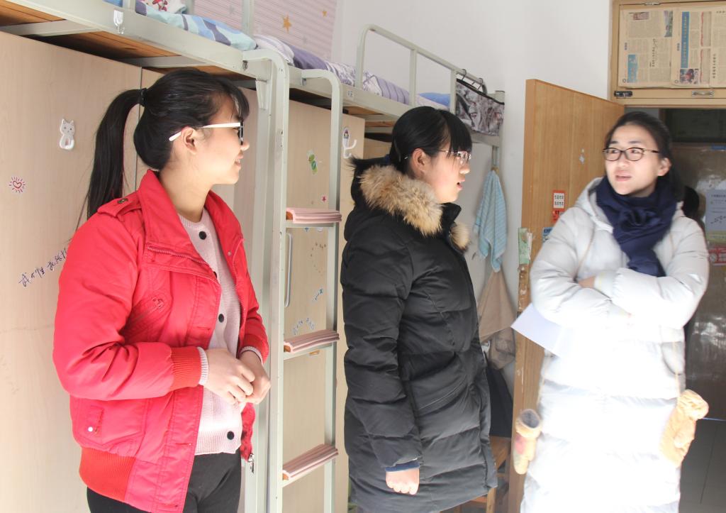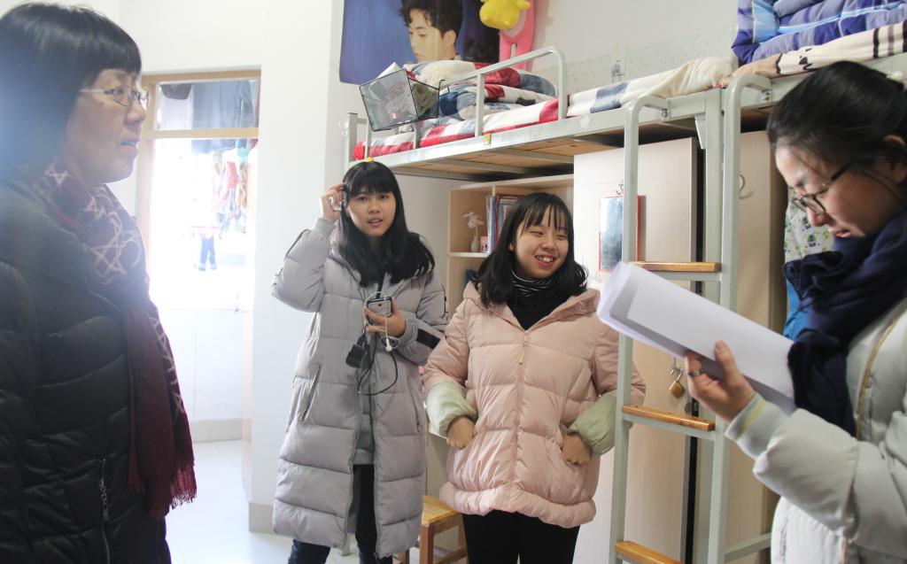 随后,老师们又来到了三号女生公寓楼。相较与一号楼,三号公寓楼内的宿舍环境布置得更加温馨。同学们亲手布置的墙纸、照片、盆栽使得宿舍生活更加惬意多彩。针对宿舍内行李箱的摆放和物品的整理情况,老师提醒同学们要合理利用空间,尽量使有限的空间得到最大化的利用。各位老师还对新疆少数民族的同学表达了关怀,就住宿与生活问题与他们进行交流。在抽查过程中,同学们对老师们的到来表示热烈的欢迎。当与老师交谈时,同学们或停下手中的工作、或围在老师身边,态度十分认真。最后,领导老师们还抽查了部分五号公寓楼的大二男生宿舍,表示该公寓楼的卫生情况基本良好。老师们对内务状况优秀的宿舍进行了表扬,并对仍需改善的宿舍表示鼓励。
