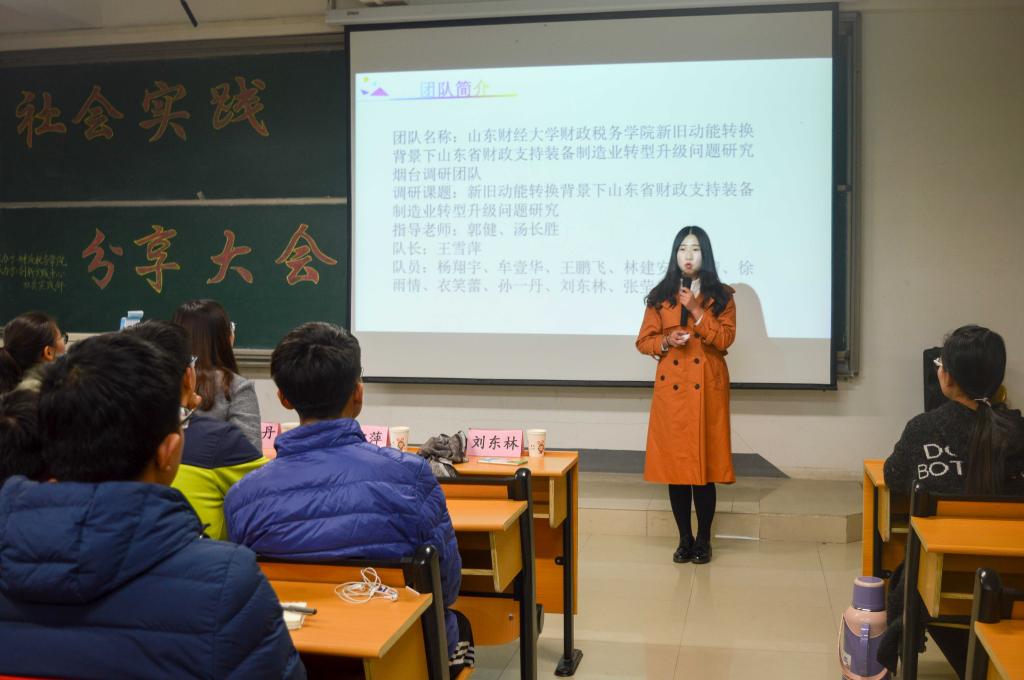 新旧动能转换背景下,山东省财政支持装备制造业转型升级问题研究烟台调研团队队长王雪萍和队员刘东林分享了他们的经验和心得。王雪萍强调要建立执行力高、志同道合的团队,要根据特长分工选择专业对口指导老师才能保障后期调研顺利进行。该团队通过参观多家大型企业,深刻认识到转型升级对装备制造业发展十分关键。她认为担任队长对自身能力提高有很大帮助,并向同学们介绍如何统筹兼顾,合理分配时间,鼓励同学们以积极的心态面对困难。