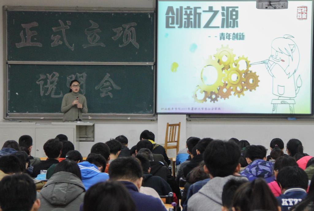 随后创新实践中心调研部部长杨俊就2017年社会实践的选题、组队、正式立项、准备工作及过程四个方面作出说明。她针对社会实践提出四点建议:第一,选题一定要以小见大,结合实际,从小实践中折射大时代背景;第二,鼓励同学申报校级团队并将根据预立项及正式立项的可行性、价值性、新颖独特性等条件进行筛选评比;第三,正式立项团队要做好准备工作,合理规划分工;第四,在提交正式立项书,完成答辩并经过审核提交校团委后就可以在暑期进行社会实践。此外,杨俊还以2016年校级优秀团队的调研报告为例,详细讲解了三千计划的选题以及调研报告的撰写等内容。