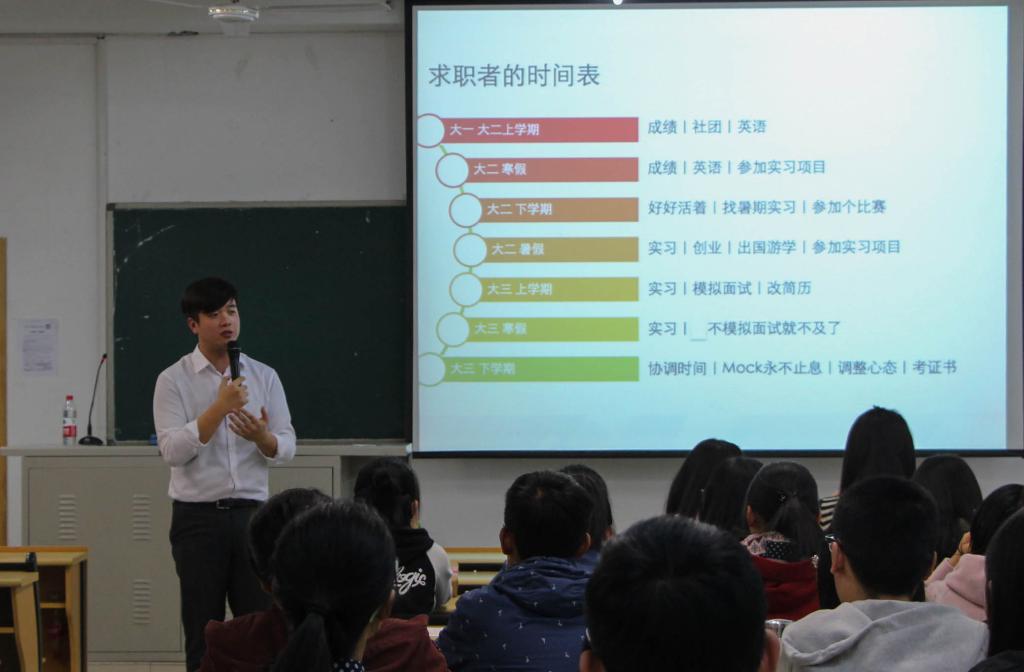 陈威霖分析了中国大学生竞争力水平,向同学们展示了合理的大学时间安排表。他认为,在大学四年中,首先要保证顺利拿到本科毕业证,拥有本科学历。其次,考取证书,例如英语四级证书、计算机二级证书、从业资格证书等,增加未来就业竞争力。同时,利用节假日进行实习,积极参与全国大型赛事也是提高就业竞争力的有效手段。