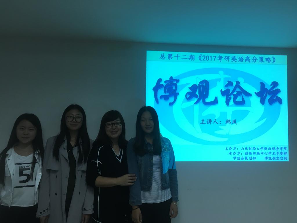 第十二期博观论坛“2017考研英语高分策略”的专题讲座于舜耕校区天舜大厦举行。主讲人是济南恩诚教育的创办人韩凤老师。出席本次博观论坛的有中文博彩网站