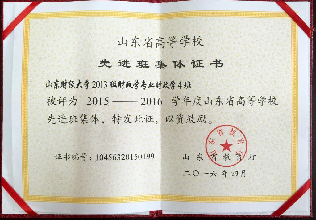 财政学专业2013级4班荣获“2015—2016学年度山东省高等学校先进班集体”荣誉称号。