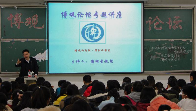 潘明星教授,硕士生导师,税收理论与政策方向学术带头人。讲座开始,潘教授提出“刻苦自立”的四字方针,希望每一位学生都能够以学习为主,提高综合素质,合理规划时间,关注时事新闻,踊跃参加社会实践活动。