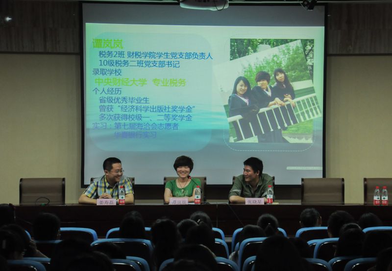 学工办主任兼团总支书记王正一老师。经验交流会的主讲人是在2013年研究生、国家公务员中考试中取得优异成绩的2010级学生谭岚岚、张超、姜寿磊、张晓星、张书经。本次交流会由财税中文博彩网站