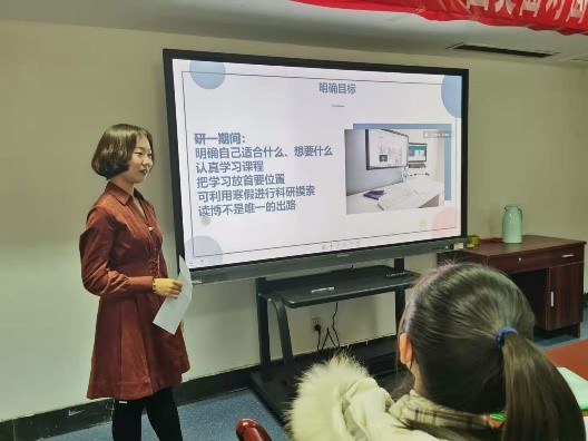 袁月同学则为大家分享了论文写作与发表的各个阶段。她建议同学们尽快确立自己的发展目标,利用好寒假时间多阅读文献,提升自己。我们在大量阅读文献的基础上确立自己的研究方向,就可以开始论文的撰写。