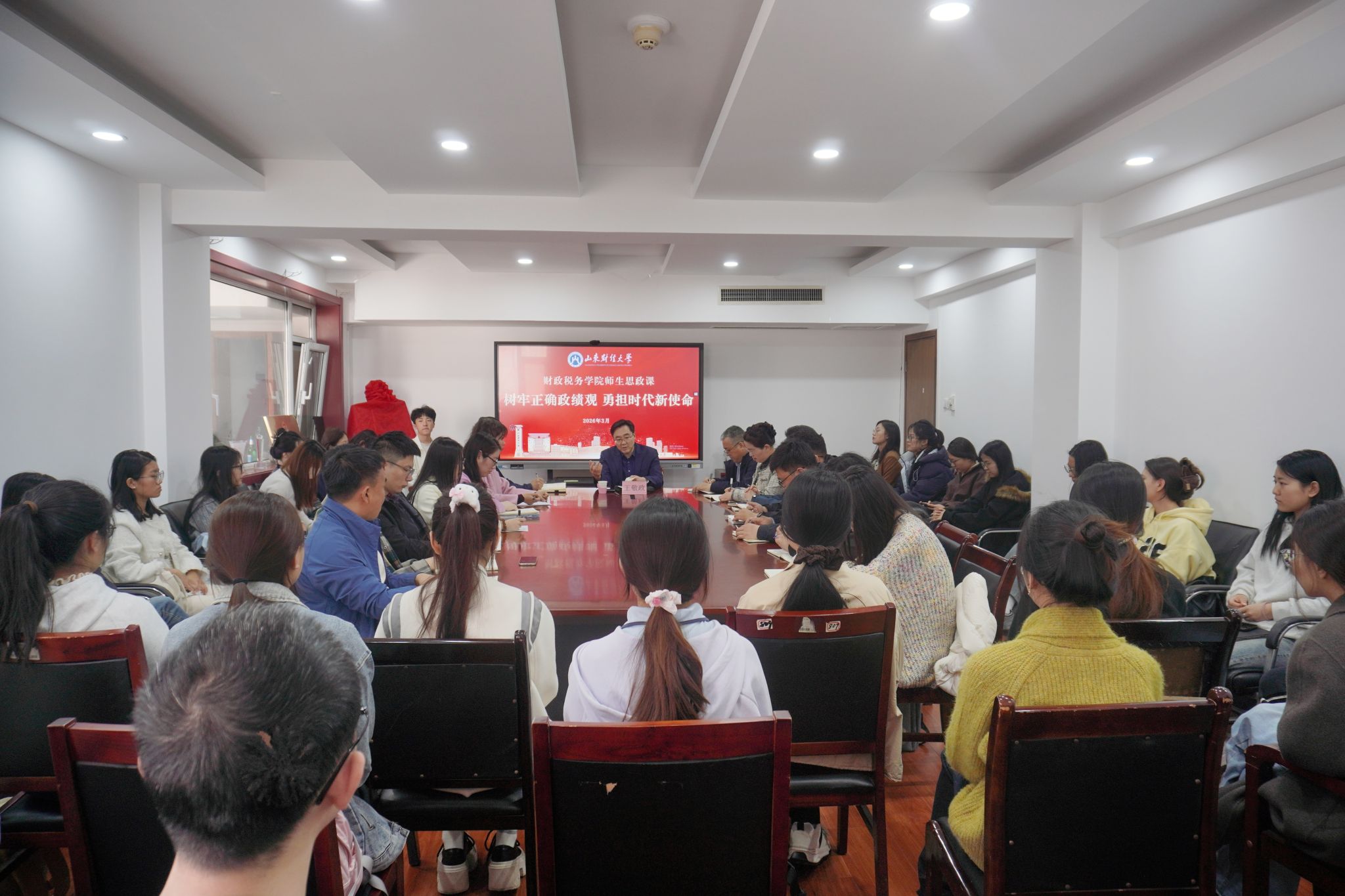 报告会结束后,王敬政与青年教师代表和所联系的2023级财政学3班学生分别召开了座谈会。