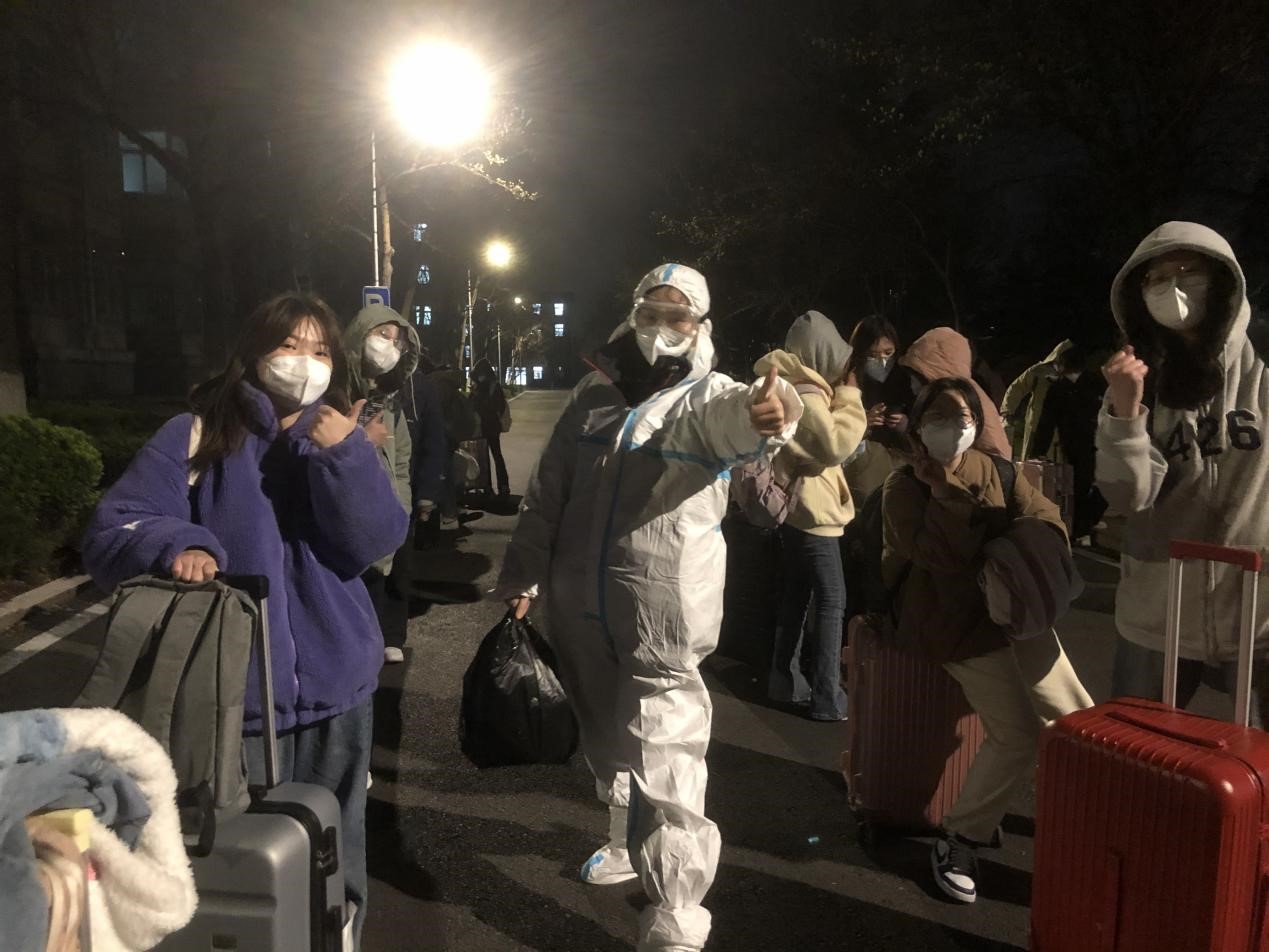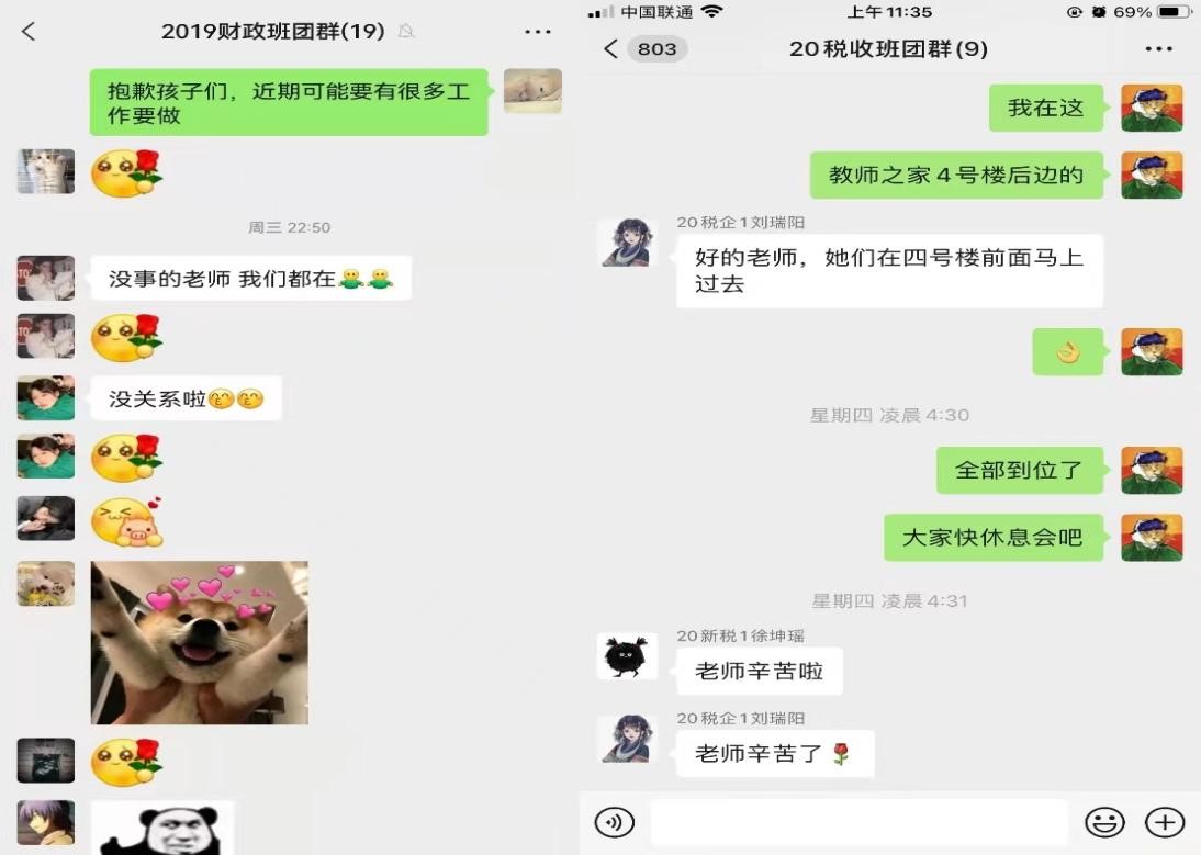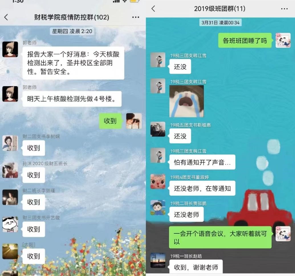 30号当天,所有辅导员老师紧急返校,看着老师们拉着行李,拿着被褥,心中无限感慨,那一刻我们知道,无论发生什么,辅导员老师始终与我们在一起。放下行李的老师,马不停蹄前往学生宿舍楼下,对所有可能有密接和次密接的同学一一进行询问、排查、统计。老师们不停地在校园里各个地方盘查,确保不漏掉任何一名学生。那一夜,老师们深夜开会,妥善安排封校期间学生的三餐、心理疏导、核酸检测等各项事宜。凌晨1点20分,辅导员都在给各自学生干部开会部署工作;凌晨2点,班级工作群依然活跃,上报统计人员信息,安排派餐事宜;凌晨3点半,各班通知需要隔离同学,做好准备;凌晨4点半,安全送走隔离学生。直到这时,忙碌了一天一夜的老师们才有片刻的喘息。