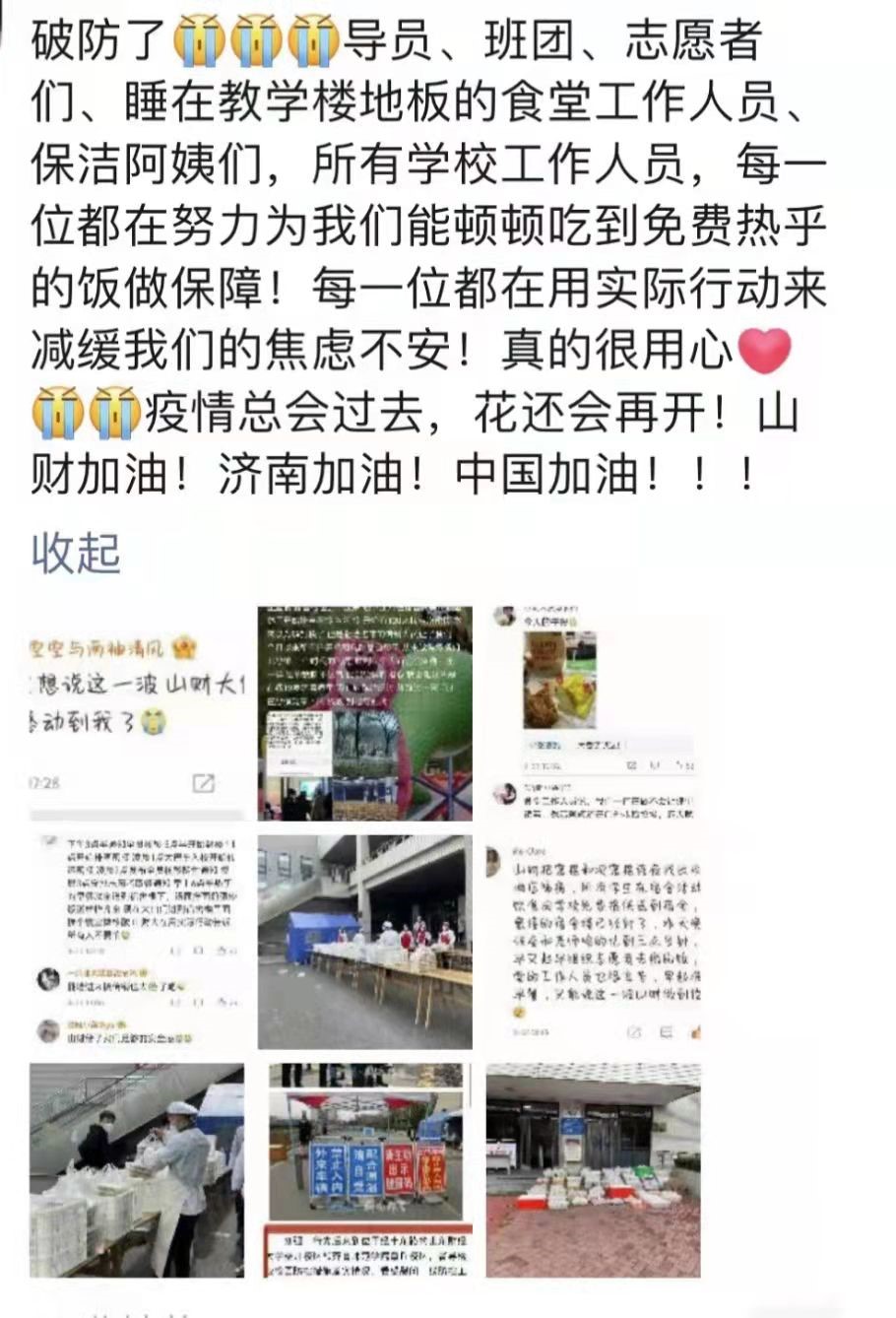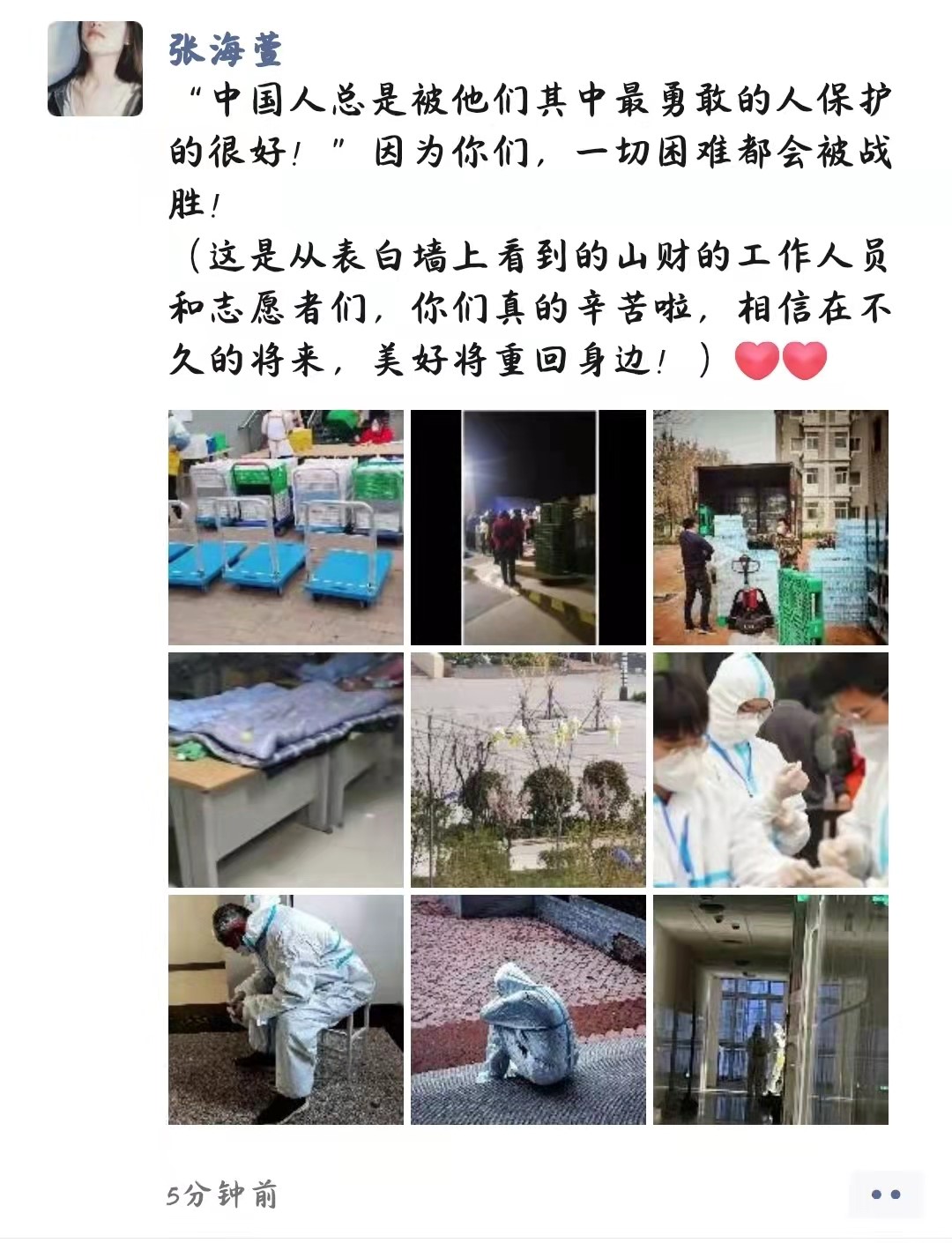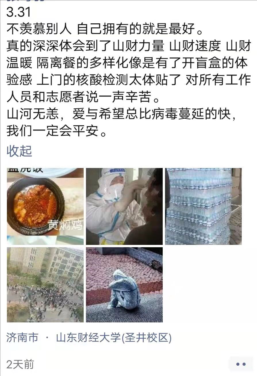 犹记一个个通知纷沓而至:“请大家进一步强调:所有学生在校园内全程规范佩戴口罩”,“请通知参加今天核酸检测的同学们,今天使用‘章丘疫情防控’小程序进行登记”,“请各班再报一下核检人数”,“接上级通知,圣井校区马上进行全员核酸检测,学生在宿舍静止,非必要不外出”……在看到这些消息后,我们瞬间有些慌乱,我们都是平凡的人,面对严峻的形势也会有胆怯的一面。但是,即使情况紧急,辅导员老师仍然在群里不停地安抚着我们的情绪。
