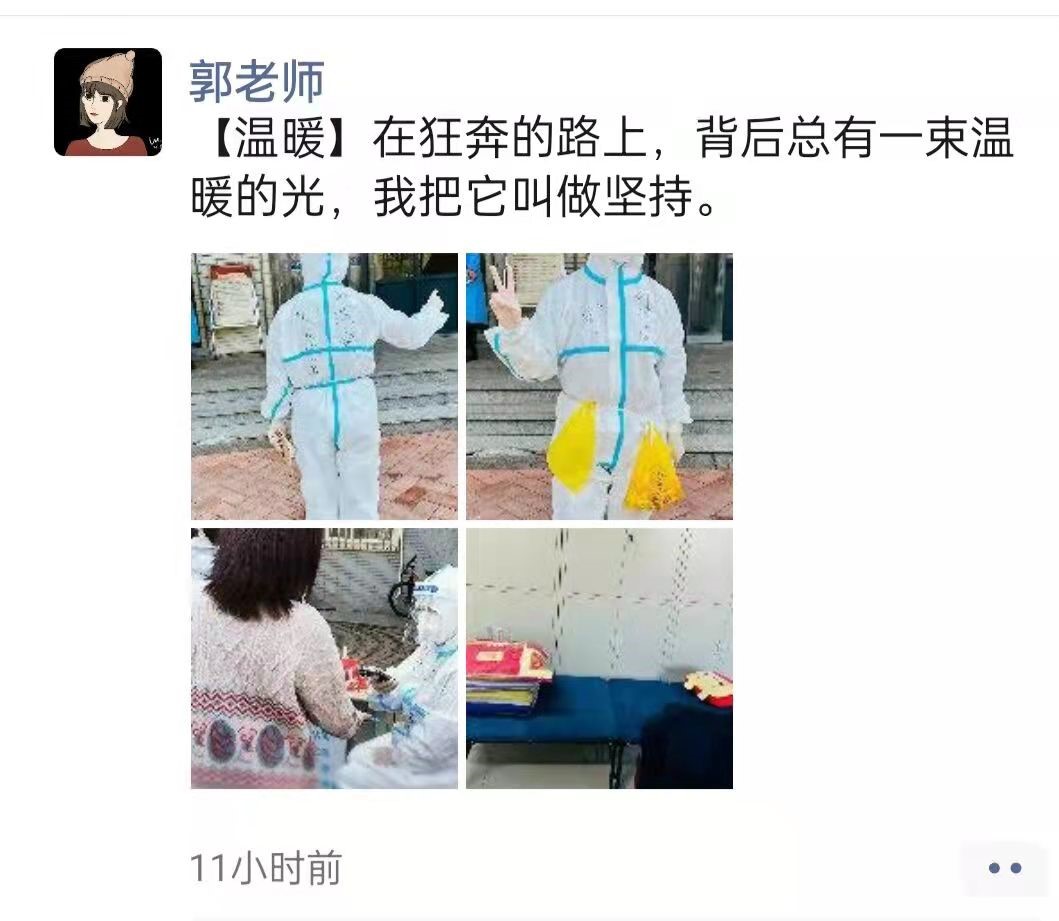 抗疫的工作总是琐碎又劳累,有时也会萌生出一些消极的想法,会迷茫,会有些不知所措。但有一天,当我们和老师在一起搬运物资时,我看见程佳老师旁边有一个小朋友,小小的人儿蹦蹦跳跳地跟在妈妈身旁,这一幕,令我感触颇多。在此次疫情突发之时,接到返校通知的一时间,拥有双重身份的程佳老师当机立断做出决定——带着孩子一起参与此次抗疫之战。她说:“是母亲,更是老师。在学生有难之时我更能体会到作为母亲的那一份担忧,所以我要尽自己所能来承担更多责任,让校外的妈妈们不再那样焦虑。万众一心,为这同一份信念而执着而坚守!”那时我在想,老师都在如此奉献自己,为我们保驾护航,我们又有什么理由抱怨,我们又凭什么对当下的生活迷惘又不知所措呢?