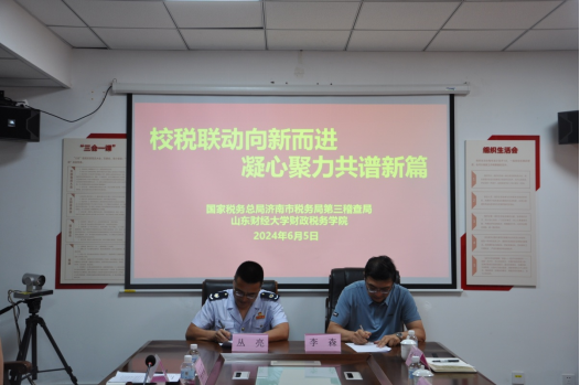 与国家税务总局济南市税务局第三稽查局共同举办了“校税联动向新而进,凝心聚力共谱新篇”主题调研交流活动暨人才联合培养合作协议签约仪式。中文博彩网站