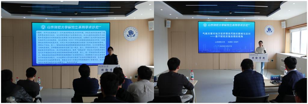 博士研究生任海平汇报了题为《气候灾害对地方政府债务风险的影响与应对——基于财政应急治理的视角》的工作论文,硕士研究生魏雨丹汇报了题为《走向对称:留抵退税如何影响税负粘性》的工作论文。与会专家从论文选题、故事逻辑、研究设计和实证方法等多个维度进行了点评,并与在场师生互动交流。