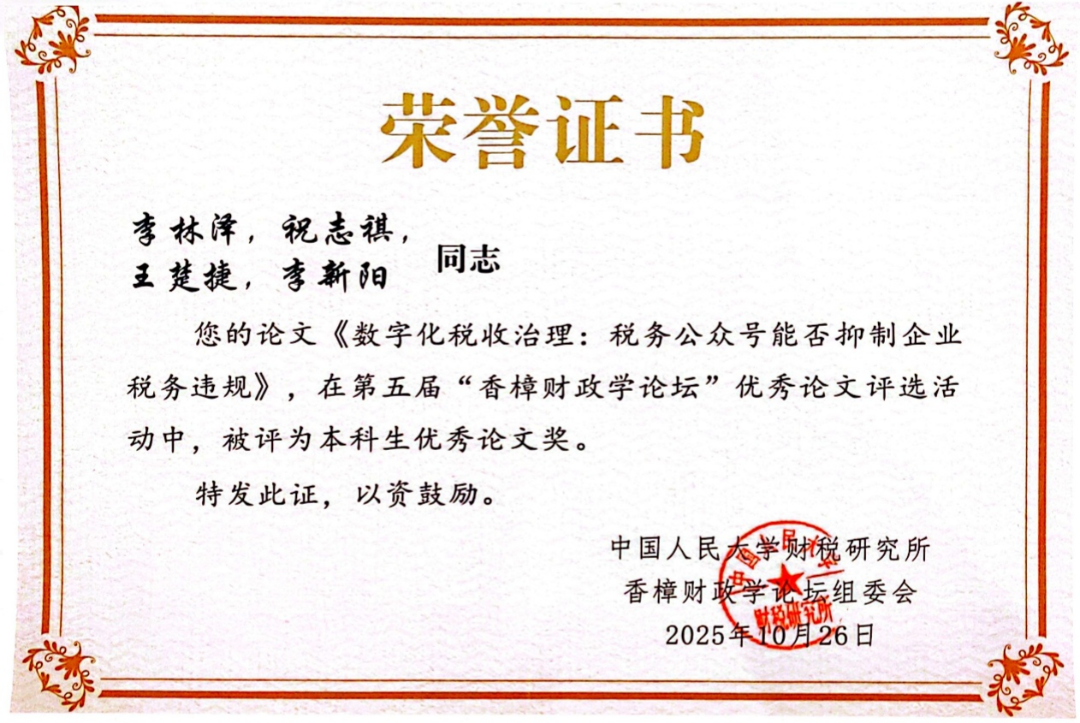 税收学23级本科生李林泽以第一作者身份荣获第五届“香樟财政学论坛”本科生优秀论文奖。