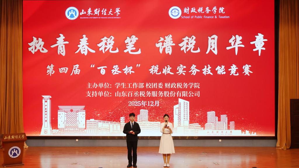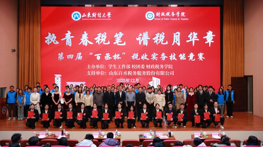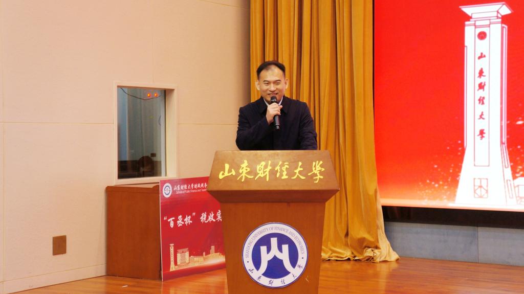 与山东百丞税务服务股份有限公司联合举办的第四届“百丞杯”税收实务技能竞赛在章丘校区图书馆报告厅举行。山东百丞税务服务股份有限公司总经理董华、副总经理景波,学校相关师生代表共400余人出席本次活动。