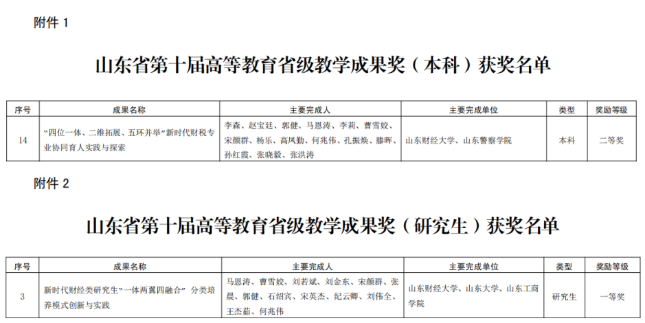 新获得两项教学成果奖。其中,马恩涛教授主持的《新时代财经类研究生“一体两翼四融合”分类培养模式创新与实践》荣获研究生教学成果一等奖,李森教授主持的《四位一体、二维拓展、五环并举”新时代财税专业协同育人实践与探索》荣获本科教学成果二等奖。