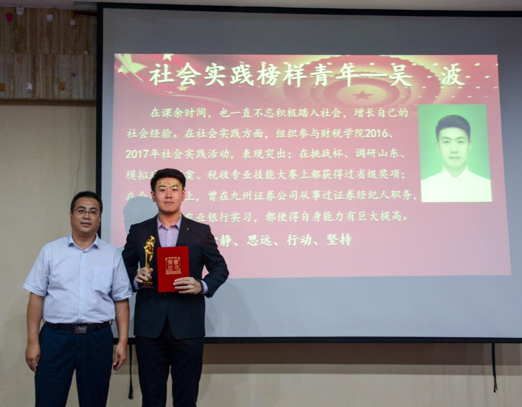 接着,“升学留学榜样青年”奖项由2015级财政学硕士孙成芳和2014级税收学六班刘晨阳获得,她们带着新时代青年的希望,靠自己辛勤的劳动换来优异的成绩。她们学有品位,学有成就,用行动践行了自己的诺言。最后一个奖项是“就业先锋榜样青年”奖项,2014级财政学三班的胡钦雷获得了 “就业先锋榜样青年”奖项。他坚信“他山之石,可以攻玉”,他用实际行动证明了他所奉行的宗旨“选好岗,稳住心,做自己”,用学识与素养打造辉煌的人生。