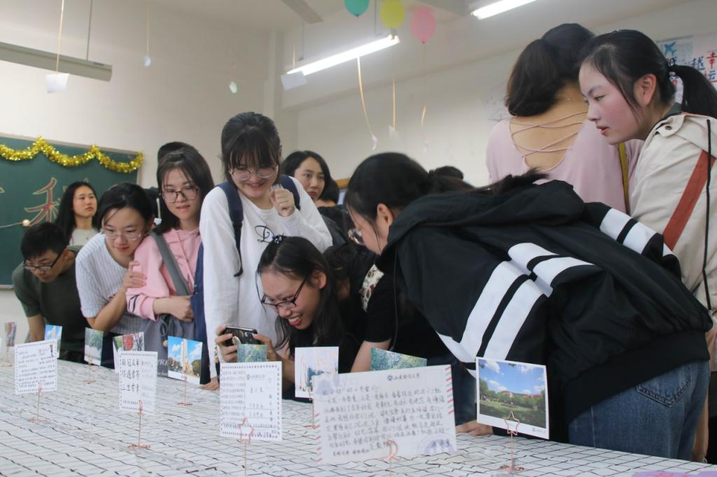 画报展馆中不仅张贴了各班集体制作的以“博学强识 滴水穿石”为主题的画报,还有各班代班们对2019级新生的寄语,寄语中充满了对新生的殷切希望。同时还有装饰梦幻的留言墙,为同学们提供了表达自己的平台。到场的同学无不被展馆温馨的感染,感叹着现场气氛的浪漫、布置的精美。