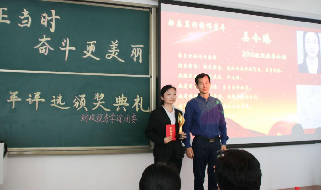 首先颁发的是“励志笃行榜样青年”奖,2016级税收学六班的姜令臻获得了此奖项。通过简短的个人视频,她向同学们介绍了自己的个人经历、曾获得的奖项荣誉,分享了个人学习经验,她建议同学们构建思维导图,能够学以致用,以从容的心态面对考试与竞赛。