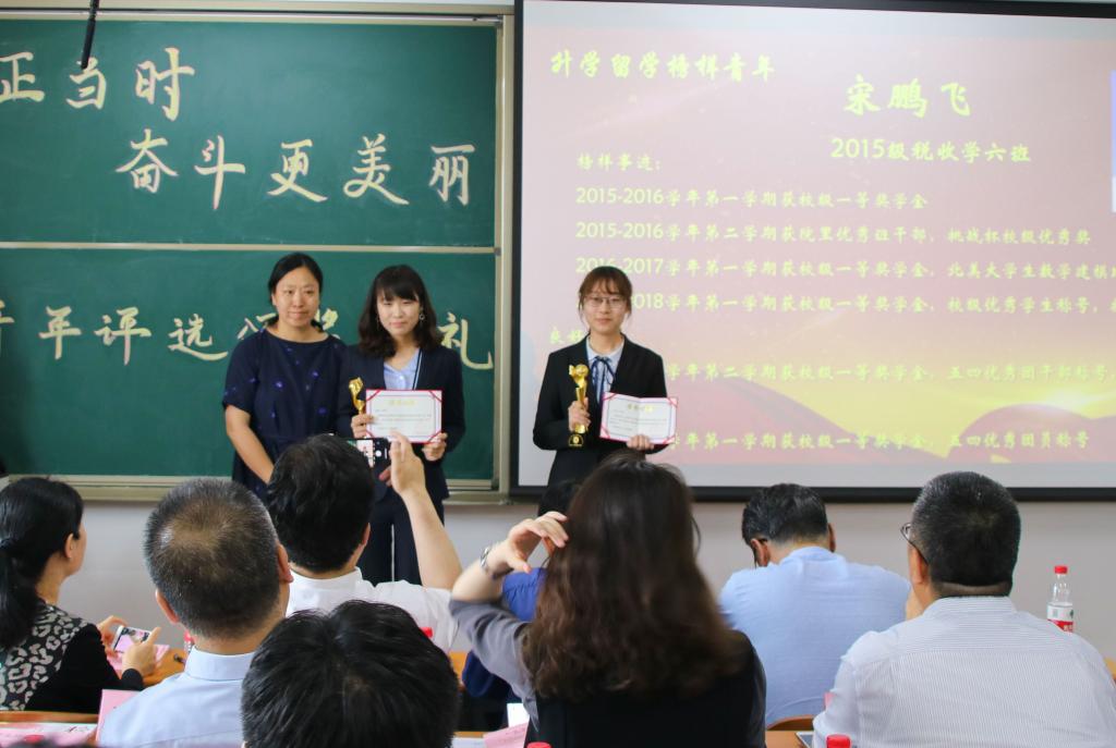 2015级税收学六班的宋鹏飞和2016级财政学研究生李鑫获得了“升学留学榜样青年”奖项。宋鹏飞以“为什么选择人民大学”开篇,向同学们解答了选择人大的原因并鼓励同学们自信努力,坚持不懈。
