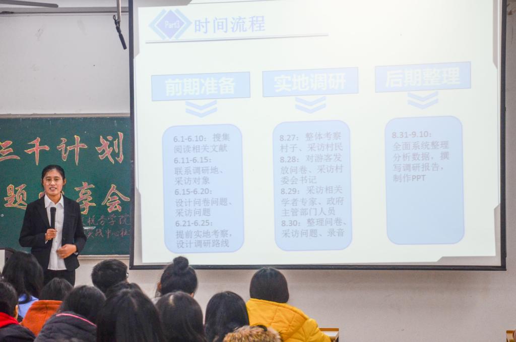 三产融合背景下农业旅游助推农村振兴的现状和发展调研团队队长李文慧进一步介绍了团队对“三千计划”社会实践的规划。她首先分享了组建团队的经验,接着介绍了团队前期准备和实地调研的情况,最后分享了撰写调研报告的体会。她希望2018级新生踊跃参与社会实践,关注社会发展,承担社会责任。
