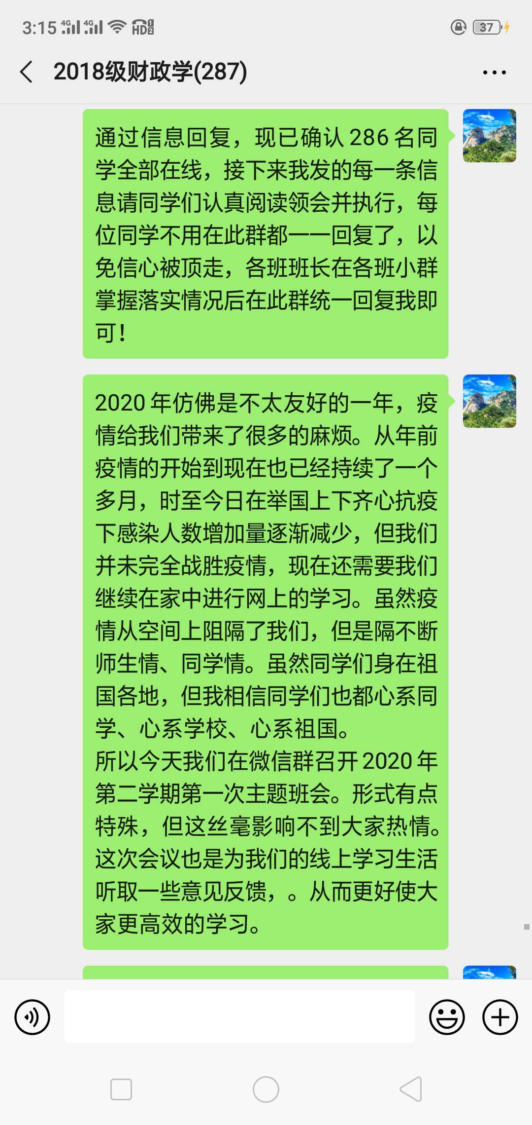 2019级辅导员老师带领学生学习领会了习近平总书记在中央关于统筹推进新冠肺炎疫情防控和经济社会发展工作部署会上的重要讲话,让同学们进一步了解了国家为战胜疫情对防疫工作做出的一系列重要部署。同时强调了每日疫情监测系统打卡的重要性,介绍了学校为防控疫情所采取的措施以及对湖北籍学生的资助情况。同学们也积极分享居家防疫、潜心求学、时间管理、能力锻炼、素养提升等方面的心得,针对网课学习遇到的问题一一分析解决。湖北籍学生分享了身边医护人员及公务人员勇敢抗疫、甘于奉献的感人故事,同学们听后深受感动。