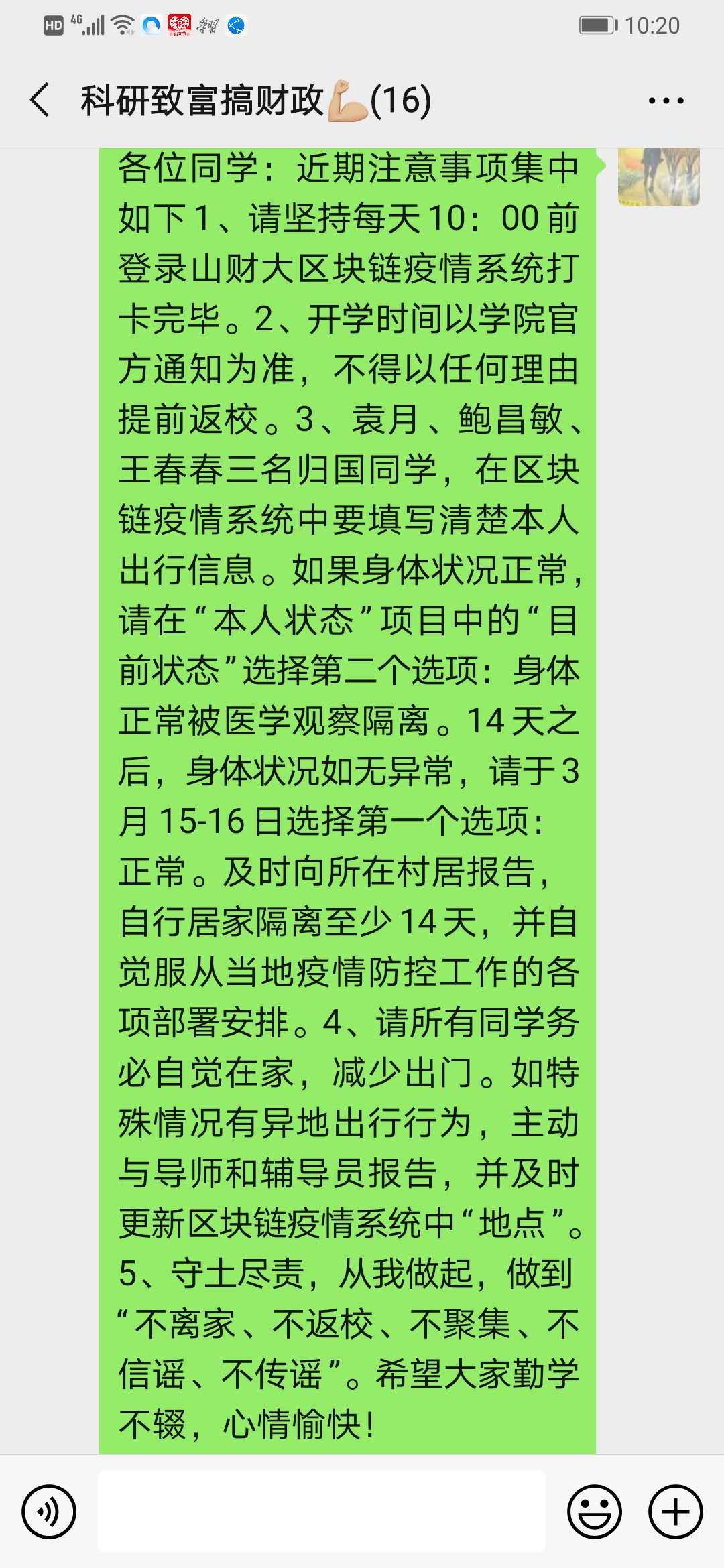 2018级辅导员老师着重强调了学校区块链疫情监测系统的打卡情况,希望各位同学能够准时准确上报,并力争做到“不离家、不返校、不聚集、不信谣、不传谣”。同时组织了关于疫情防控措施的经验交流,并嘱咐同学们尽量减少出门次数,在家也要做到勤消毒,保持个人卫生,积极进行适当的体育锻炼,加强自身的免疫力。鼓励同学们认真进行网课的学习,在假期中多完成一些想做的事情,提升自己的能力,拓宽自己的知识储备。