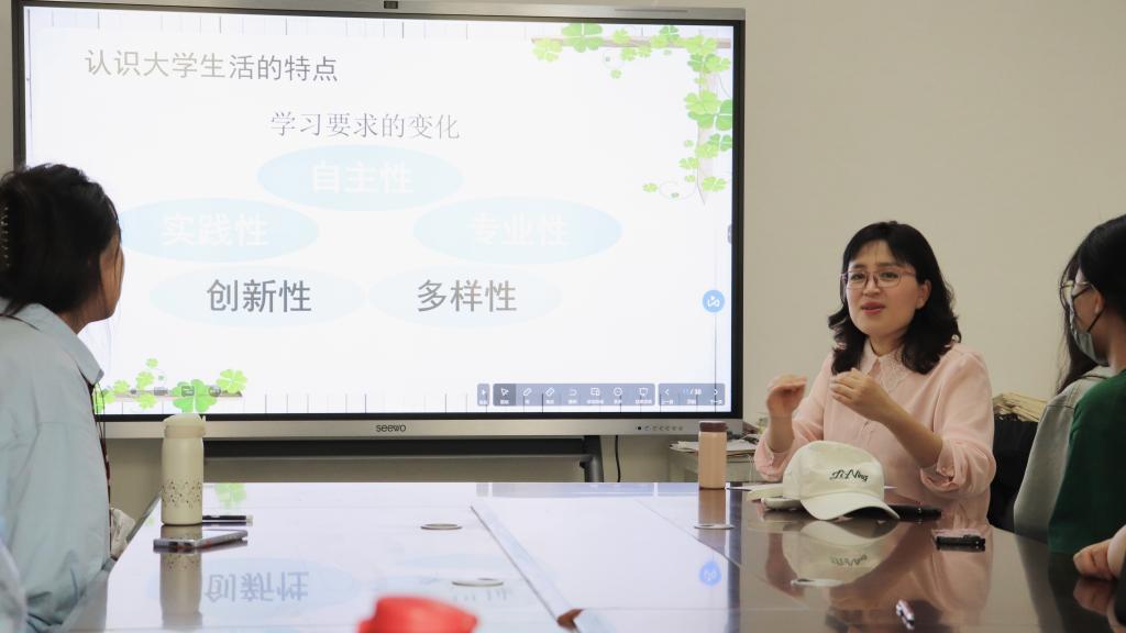 滕晖详细了解同学们近期学习生活情况,并对相关问题进行了耐心解答。她围绕当代大学生发展核心素养,从悦纳自己、重审大学、知晓社会、规划未来等方面进行讲解,帮助同学们不断完善自己的职业规划和未来发展路径。她要求同学们要不断提高政治素养,积极参加相关理论学习,厚植爱国主义情怀;要注重提升学习能力,提升就业竞争力;要积极参加社会实践,注重团队合作,学会交流沟通,培养基本职场技能。全体学生干部和学生党员要严守纪律规矩,做清正廉洁表率。