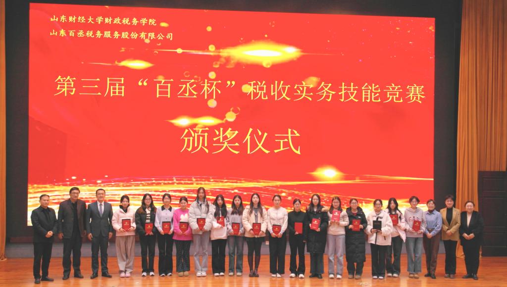 第三届“百丞杯”税收实务技能竞赛于圣井校区图书馆报告厅圆满落下帷幕。山东百丞税务服务股份有限公司总经理董华、合伙人田峥峥,中文博彩网站