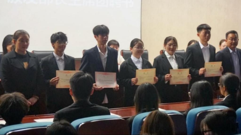 会议在庄严的国歌声中拉开帷幕。李昕鑫宣读了24届学生会及学生成长服务中心干事名单。滕晖、曹同锋、李峻汝、程佳、李昕鑫分别为2024届主席团成员及各部长颁发聘书。